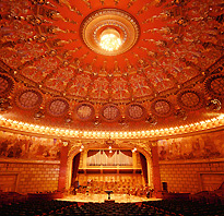 A ring of pink marble columns is linked by flowing arches where elaborate brass lanterns hang like gems from a necklace. Inside the concert hall, voluptuous frescoes cover the ceiling and walls. Renowned worldwide for its outstanding acoustics, it is Bucharest’s most prestigious concert hall and home of the Romanian George Enescu Philharmonic.